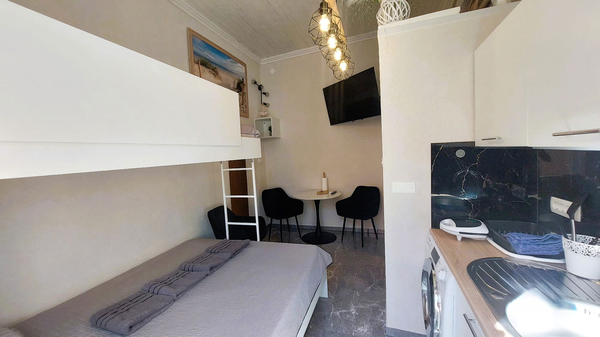 Izjemno svetla garsonjera z visokim stropom, kar da občutek prostornosti